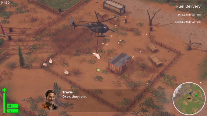 A "megoldjuk okosba'" logika viszont nem csak itthon, hanem a tengerentúlon is dívik, Travis így természetben (na nem úgy...) áll neki leróni adósságát a helyi rozsdagóré felé, ami remek ürügyet teremt arra, hogy a játék megtanítsa az irányítás (és különösen a gép hasára szerelt csörlő kezelésének) alapjait. A roncstelepről felszállva így pár percen belül azon kapjuk magunkat, hogy csirkéket dobálunk egy karámba, üzemanyagtartályokat mozgatunk a helyükre (vagy épp robbantjuk fel őket, ha nem vagyunk elég ügyesek...), illetve visszaszerezzük azt az ellopott terepjárót, amivel a helyi bajkeverő milicisták oldanak kereket megbízónk roncstelepéről...