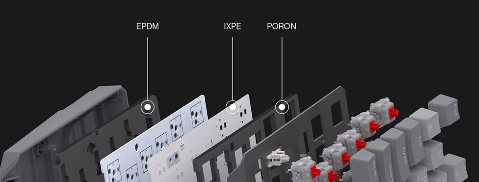 Az Endorfy alapból (a holnap tanulsága szerint) piros switcheket rak a készülékbe, nekünk viszont a "yellow" kapcsolókkal szerelt Thock V2 jutott a tesztlaborba. A készülék design filozófiájában fontos részlet a háromszoros hang-csillapítás. Három külön akusztikus csillapító-réteg található a készülékházban, a Space pedig extra gumiréteggel is el van látva. Mire jó mindez? A készülék így egyenletes pötyögési hangélményt kínál akusztikus csengések, felharmónikusok vagy visszhang, esetleg üres kongó effektus nélkül. Bizony, a Thock nevében is benne van a telt, középmély frekvencián megszólaló matt hang; aki az ilyet szereti, annak tuti ASMR élménye lesz majd a kellemes koppanásoktól. Szeretünk a technikai mélységekben elmerülni: a három rétegből a Poron gyakorlatilag egy mikrocellás poliuretán, az EPDM egy etilén-propilén kaucsuk, gumiszerű viselkedéssel, az IXPE pedig egy hő- és tűzálló polietilén. Aki ettől többet akar tudni, annak ajánljuk a következő oldalt további okosodásra.