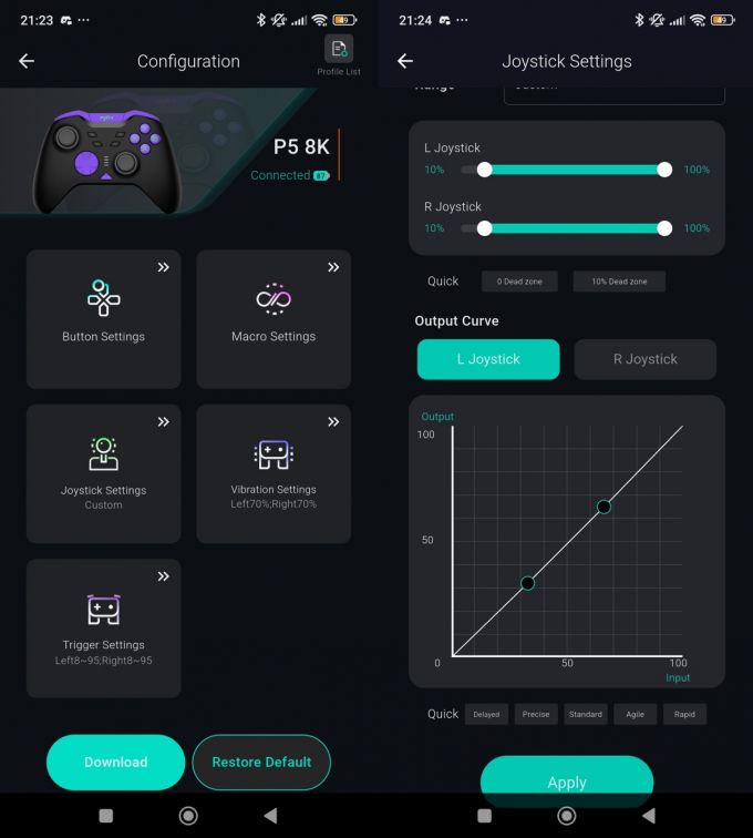 A sok gomb azonban messze nem minden! A 3rd party cuccokra jellemző makrók konfigurálásán szinte nem is lepődünk meg, de a gombok különböző kombinációi rejtett funkciókkal is bírnak. Például konfigurálhatjuk az analóg karok "dead zone" holtterét, a játékból kimaradó középrészt, vagy a kerületet, ahol a mozdulatunkkal az analóg skála végére érünk (magyarul: összébb húzhatjuk az analóg valódi érzékelési korlátait). Emellett a motor rezgésének erősségét, a turbó-beállításokat, na meg a kontroller nullázását, és asztali kalibrálását is elvégezhetjük gyorsgombokkal. Erről a jópofa kézikönyvből is tájékozódhatunk, de nálam itt jött egy újabb meglepetés. A kontrollert ugyanis egy modern felületű applikációval, a PXN Nexussal is konfigurálhatjuk. A szoftver nálam Androidon azonnal párosult a P5 8K készülékkel. Itt nem csak olyan alapadatokat tudunk megnézni, mint a töltöttség, vagy a Firmware státusza, de frissíthetjük is az eszközt, sőt makrókat konfigulhatunk, a rezgés erejét állíthatjuk, vagy kimeneti görbéket szabhatunk az analógok számára, egy grafikus interfészen keresztül.