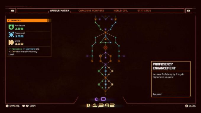 Na és akkor menjünk egy kicsit mélyebbre, mert vannak még itt nagyon fontos változások. Ezek nagyjából két részre oszthatók: az Armour Matrixre és a Carcosan módosítókra. Az Armour Matrix lényegében egy permanens fejlődési fa, ahol nem új képességeket, hanem az alap tulajdonságainkat fejleszthetjük. Ehhez két nyersanyag kell: a Lucenite, amit a pályákon tudunk felszedni, illetve ez esik az ellenfelekből is és gyakorlatilag végtelenül farmolható, illetve a nagyon ritka, biome‑onként limitált Halcyon, amit csak random pickupként találunk meg. A játék azt is jelzi, hogy melyik biomban mennyi Halcyon maradt, így ez egy tiszta grind mechanika: egyszerűen csak újra és újra teljesíteni kell a pályákat, főleg a mellékküldetésekre ráfeküdve.