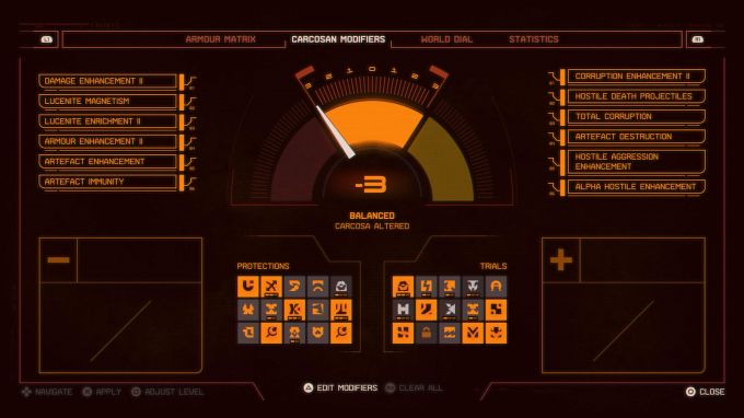 Ha megvannak, mi döntjük el, milyen játékstílussal és céllal akarunk lemenni egy biomba. A rendszer lényege, hogy a skálán –3 és +3 között KELL maradni, tehát egyik irányba sem csúszhatunk túl. Innen jön a matek: ha azt akarjuk, hogy a korrupció gyorsabban lejöjjön rólunk (mondjuk –4 pont), és közben többet akarunk sebezni, és kevesebbet sebződni, (újabb –4, –4), akkor már –12-nél járunk, amit kompenzálni kell a másik oldalon. Ilyenkor el kell dönteni, gyűjtögetős runt vagy boss kill runt akarunk: például kikapcsolhatjuk a Halcyon dropot a pályán (+6 pont), és mellé betesszük, hogy a korrupció gyorsabban terjedjen rajtunk (+3 pont), mert úgyis korrumpált fegyvert tervezünk használni és így szépen visszajövünk –3-ra, és lockolhatjuk a beállítást.