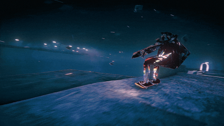 A vezetett pályák csőszerűek, gyakorlatilag az addig megtanult mozdulatok alapján kell rajtuk amolyan ügyességi játékként végigmenni. Az ezek után érkező nyitott tereken pedig óriási neonkoponyáknak, irizáló nyúlnak, furcsa mosodás pacadémonnak, meg ki tudja kiknek kell különböző küldetéseket végrehajtanunk. A terep ilyenkor adja vissza leginkább a városi miliő poklát. Sam ugyan múzsaként tekintett New Yorkra, de az urbánus pokol romantikájához nekem lehet többet kellett volna New Yorkban járnom, vagy darkwave-bulik vizualizereire flesselnem. Mégis azt mondom, a terepek jól kidolgozottak, és mindenhol találni elszórva kombó-szorzókat turbózó tereptárgyakat vagy apró bónuszokat. Ha pl. elkapjuk a repülő üveggúlákat, vagy kombózgatunk egy-egy megvilágított tereprészleten, úgy "lelket" kapunk, ami a játék valutája. A lelkekért cserébe tudunk új deszkát, függőt, kereket és matricát venni.
